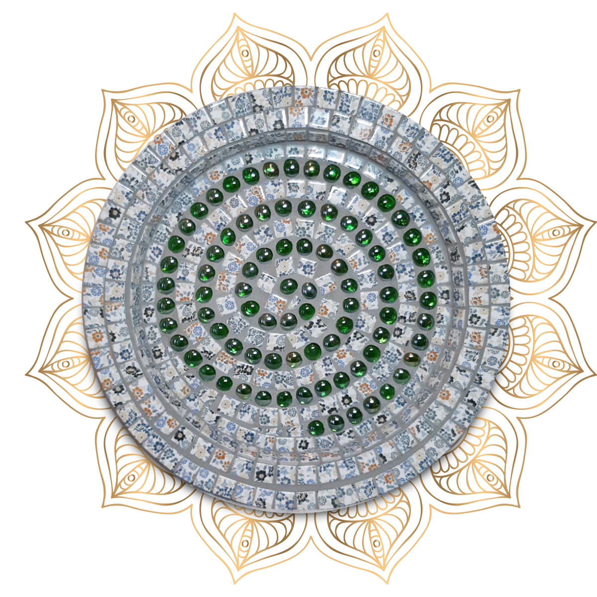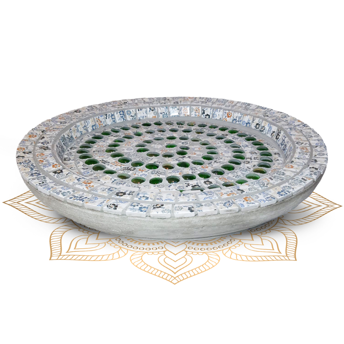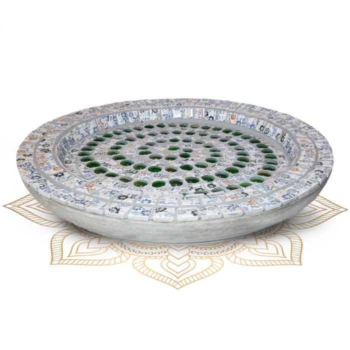 Ein Unikat, dass jeden Rätselliebhaber anspricht. Die mühevoll ausgesuchten Mosaikkacheln sind unsere ganz persönliche Omasch an das lateinische Spiel „Sudoku“. Die innere, grüne Spirale visualisiert, den durch „Logik“ erringenden Flow, den man erfährt wenn man sich vollends auf das Spiel einlässt. Diese Schale ist perfekt für Ihren Garten oder für Ihren Balkon. Als Vogelbad genutzt, kann dieses Werk mit Wasser und / oder mit Vogelfutter befüllt werden.